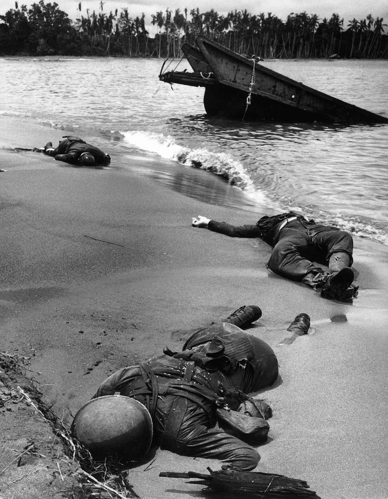 The photo captured three dead Americans partially buried in the sand of a beach. It was taken 14 months into the war, in February of 1943, by Life Magazine photographer George Strock.