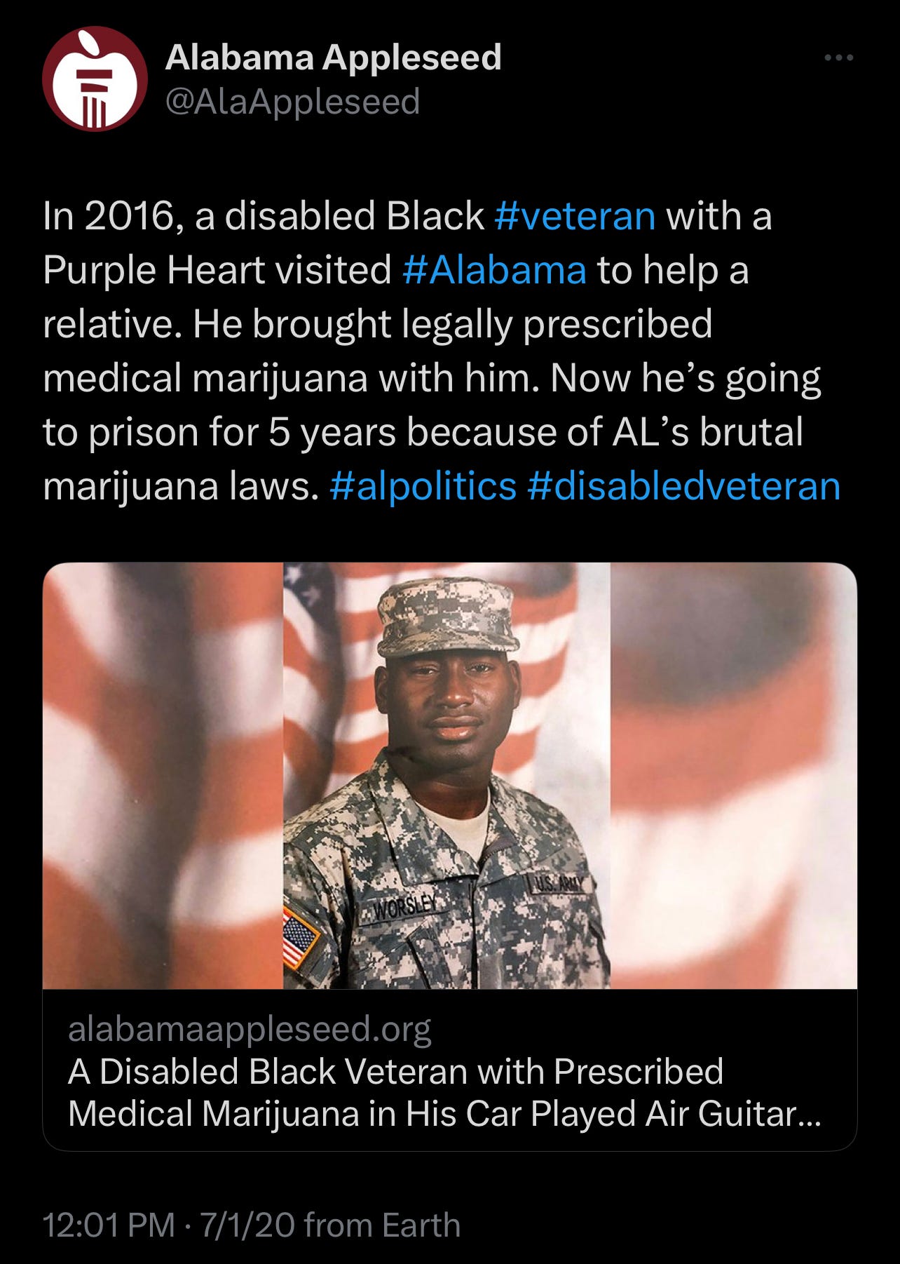 I found this particular story in July 2020. It began with a Tweet. An Iraq War veteran was serving five years in prison for possession of marijuana in Alabama, where the drug is illegal. The catch? The pot was legally prescribed in Arizona to treat his post-service issues like Post Traumatic Stress and Traumatic Brain Injury. His name is Sean Worsley.